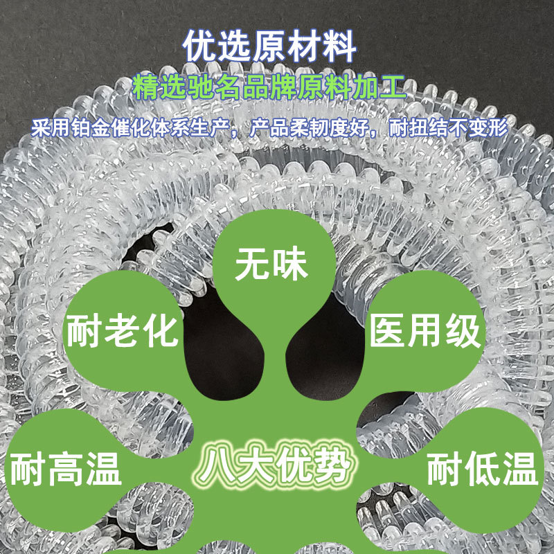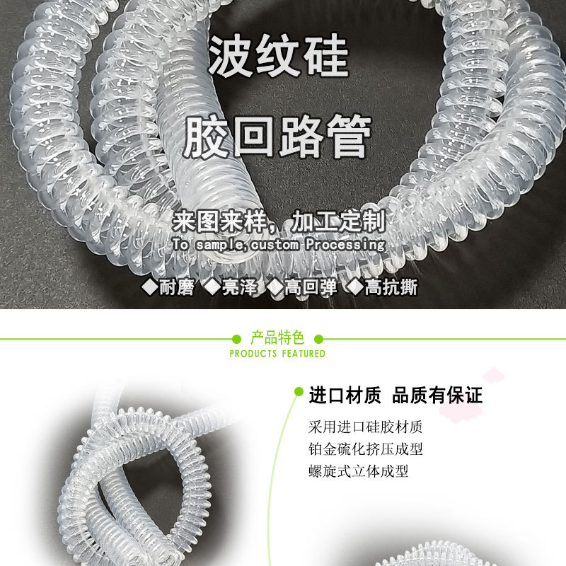 靜海波紋硅膠管:采用進口硅膠原材料,連續(xù)擠出一次成型,內(nèi)壁平滑;常規(guī)硬度60度(邵氏硬度20-80度);耐溫范圍廣(-50~+280℃),可以適應(yīng)高、低溫設(shè)備需求,并耐老化。常規(guī)PE袋+紙箱包裝,特殊要求可按客戶標(biāo)準(zhǔn);產(chǎn)品符合SGS、FDA、LFGB、生物相溶性等;用于醫(yī)用設(shè)備、麻醉機、機械連接、食品傳送設(shè)備等。
