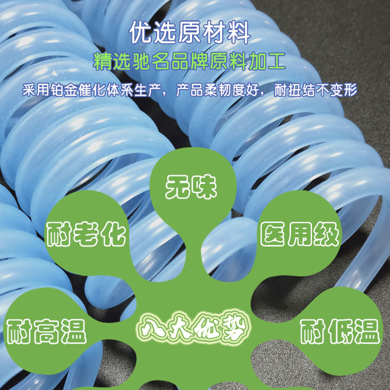 彈簧拉伸式硅膠管: 采用特種硅膠原材料,連續(xù)擠出成型,內(nèi)壁平滑;常規(guī)硬度70度(邵氏硬度30-80度);耐溫范圍廣(-50~+280℃),可以適應(yīng)高低溫設(shè)備需求,并耐老化。常規(guī)PE袋+紙箱包裝,特殊要求可按客戶標(biāo)準(zhǔn);產(chǎn)品符合SGS、FDA、LFGB、生物相溶性等;用于醫(yī)療激光洗牙機(jī),醫(yī)用設(shè)備、呼吸傳送等設(shè)備。