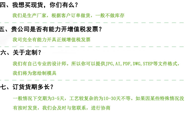 產(chǎn)品硬度 | 打樣時間 | 7天內(nèi) | 產(chǎn)品樣板 | 現(xiàn)樣免費 | |
