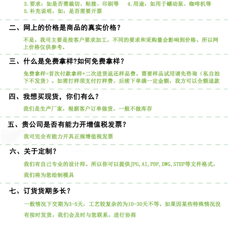 產(chǎn)品硬度 | 20-80A | 打樣時(shí)間 | 7天內(nèi) | 產(chǎn)品樣板 | 現(xiàn)樣免費(fèi) |
