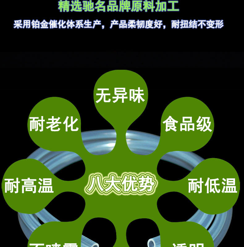 抽水壺硅膠管采用進(jìn)口硅膠原材料,利用科學(xué)的生產(chǎn)工藝,內(nèi)壁平滑;常規(guī)硬度60度(邵氏硬度值30-90度);耐溫范圍廣(-50~+280℃),可以適應(yīng)高、低溫設(shè)備需求,并耐老化。常規(guī)PE袋+紙箱包裝,特殊要求可按客戶標(biāo)準(zhǔn);產(chǎn)品符合SGS、FDA、LFGB、生物相溶性等;用于凈水機(jī)、灌裝機(jī)、蠕動(dòng)泵專用、醫(yī)療醫(yī)用器械等。