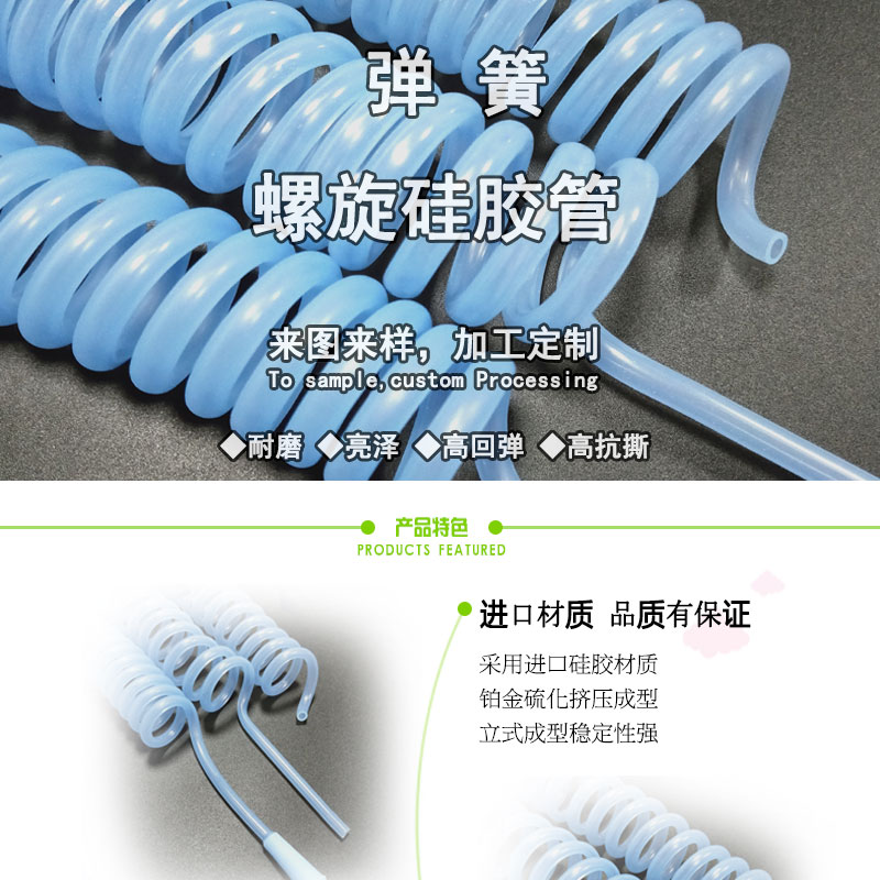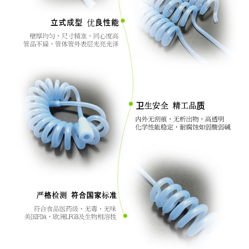 寶坻彈簧拉伸式硅膠管: 采用特種硅膠原材料,連續(xù)擠出成型,內(nèi)壁平滑;常規(guī)硬度70度(邵氏硬度30-80度);耐溫范圍廣(-50~+280℃),可以適應(yīng)高低溫設(shè)備需求,并耐老化。常規(guī)PE袋+紙箱包裝,特殊要求可按客戶標(biāo)準(zhǔn);產(chǎn)品符合SGS、FDA、LFGB、生物相溶性等;用于醫(yī)療激光洗牙機(jī),醫(yī)用設(shè)備、呼吸傳送等設(shè)備。