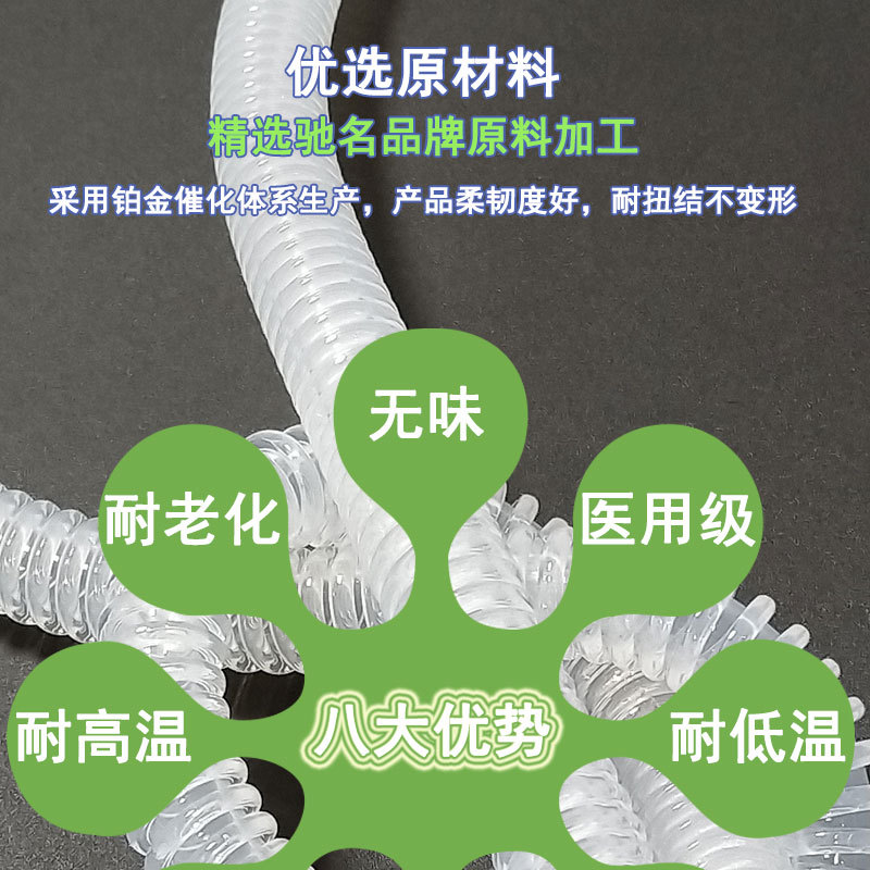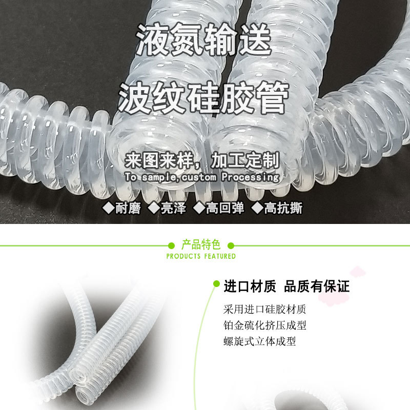 北辰液氮輸送波紋硅膠管:采用進(jìn)口硅膠原材料,連續(xù)擠出一次成型,內(nèi)壁平滑;常規(guī)硬度70度(邵氏硬度30-80度);耐溫范圍廣(-50~+280℃),可以適應(yīng)高、低溫設(shè)備需求,并耐老化。常規(guī)PE袋+紙箱包裝,特殊要求可按客戶標(biāo)準(zhǔn);產(chǎn)品符合SGS、FDA、LFGB、生物相溶性等;用于呼吸機(jī)、麻醉機(jī)、制氧機(jī)、液氮輸送管道等。