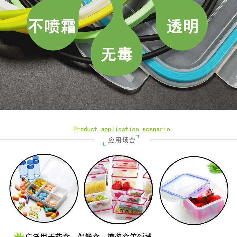 產(chǎn)品用途: 用于飯盒密封圈,保鮮盒密封圈,真空盒密封圈等