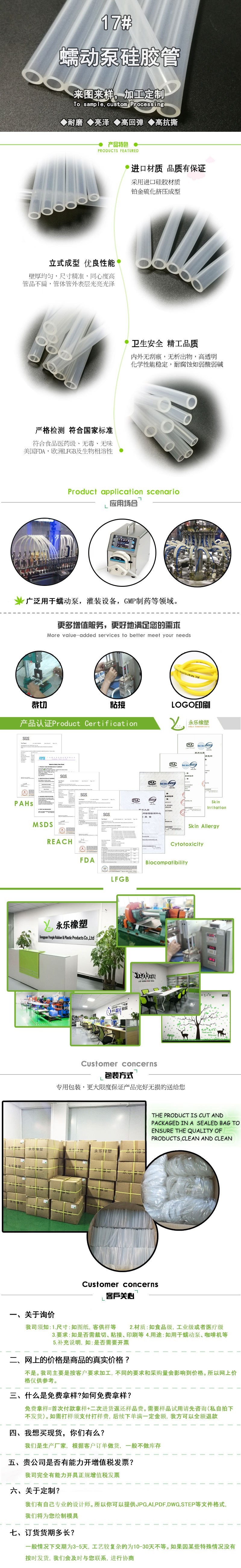 19#蠕動(dòng)泵硅膠管:采用進(jìn)口硅膠原材料,連續(xù)擠出一次成型,內(nèi)壁平滑;常規(guī)硬度60度(邵氏硬度值30-90度);耐溫范圍廣(-50~+280℃),可以適應(yīng)高、低溫設(shè)備需求,并耐老化。常規(guī)PE袋+紙箱包裝,特殊要求可按客戶標(biāo)準(zhǔn);產(chǎn)品符合SGS、FDA、LFGB、生物相溶性等;用于灌裝機(jī)、蠕動(dòng)泵專用、醫(yī)療醫(yī)用器械、輸液泵等。