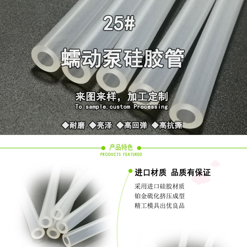 25#蠕動泵硅膠管:采用進口硅橡膠原料擠出成型,管口程圓形,不扁形變小,析出物少,壁厚均勻,化學性能穩(wěn)定;常規(guī)硬度60度(邵氏硬度值30-90度);耐溫范圍廣(-50~+280℃)。常規(guī)PE袋+紙箱包裝,特殊要求可按客戶標準;產(chǎn)品符合SGS、FDA、LFGB、生物相溶性等;用于灌裝機、蠕動泵專用、醫(yī)療醫(yī)用器械、輸液泵等。
